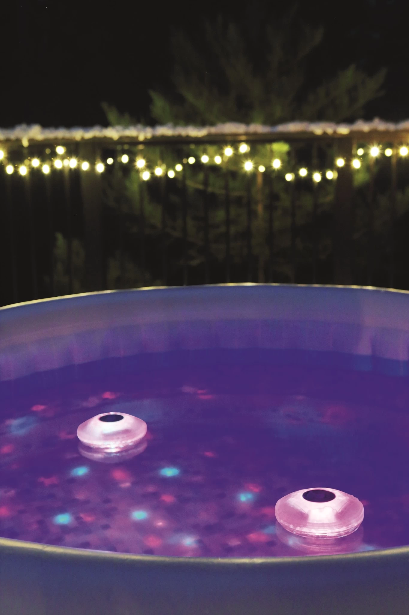 Bestway drijvende ledverlichting voor het zwembad en spa. In te stellen op 4 kleuren: geel, rood, blauw en groen en knipperlicht. Werkt op 3AAA batterijen (niet inbegrepen), dus geen kabel of elektrisch nodig. Lichtcirkel van 243 cm wijd en 152 cm diep. Een druk op de knop aan de bovenkant zet hem aan en het apparaat schakelt zichzelf uit na 1 uur. Afmeting: Ø 14 cm.