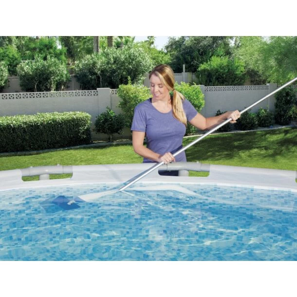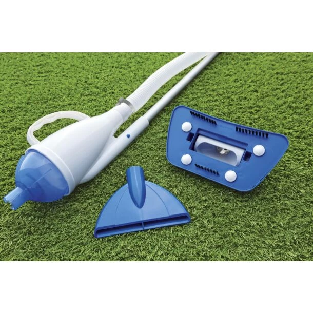 De reinigingsset bevat 4 lichtgewicht aluminiumpalen die samen een steel van 190 cm vormen. De stofzuiger is ideaal voor het reinigen van zwembaden met een diameter kleiner dan 457 cm. Er zijn 2 verwisselbare mondstukken die op de steel kunnen worden aangesloten. Één heeft een borstel voor het verwijderen van hardnekkig vuil en de andere heeft een standaard zuigkop voor het opzuigen van los vuil. Je hebt dus eigenlijk 2 zwembadstofzuigers in 1.