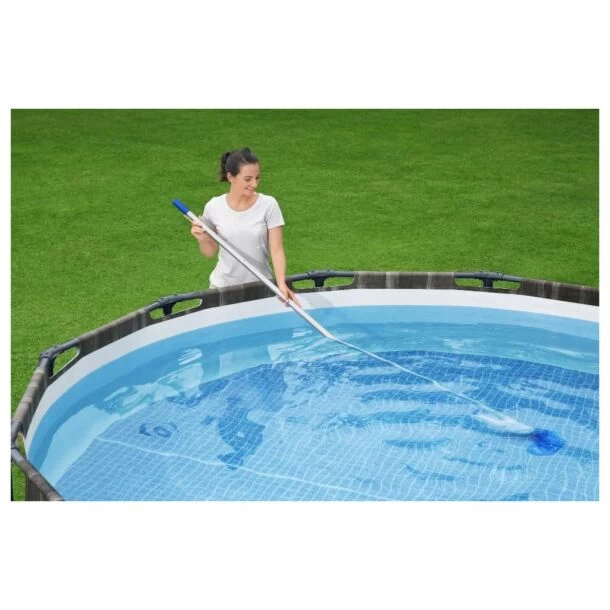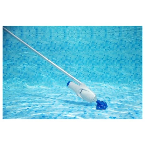 De stofzuiger glijdt soepel over de bodem dankzij de zuigmond met wieltjes en borstels en door de transparante opvang is gemakkelijk te zien wanneer het filter vol is. De stofzuiger kan voor gebruik in grotere zwembaden aangesloten worden op een telescoopsteel (niet inbegrepen).