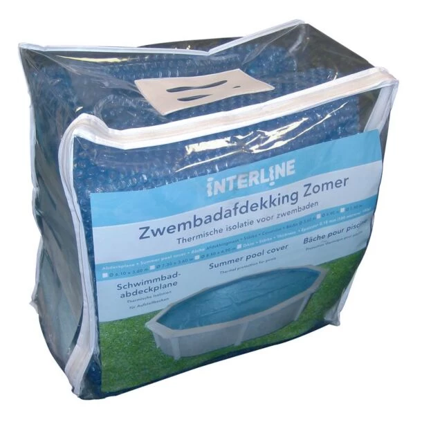 Bescherm uw zwembad in de zomer met het Interline omerafdekking. De zomerafdekking is gemaakt van blauwe UV-bestendige noppenfolie, zelfdrijvend en isolerend. Het afdekzeil is geschikt voor inbouw- en opzetzwembaden. De afdekking voorkomt warmteverlies van het water. Het zeil slaat zonnewarmte op gedurende de dag en houdt de warmte vast gedurende de nacht. het vertraagt water verdamping, beschermt tegen vuil en verlengt uw zwemseizoen.